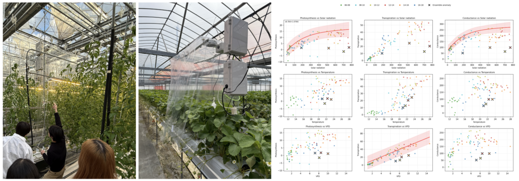 愛媛大学農学部 緑化環境工学研究室では、施設園芸および環境制御型農業における植物のモニタリング・モデリング・制御に関する研究を行っています。植物が環境条件にどのように応答するかを理解し、データ駆動型の手法によって生産性や資源利用効率を向上させることを目指しています。