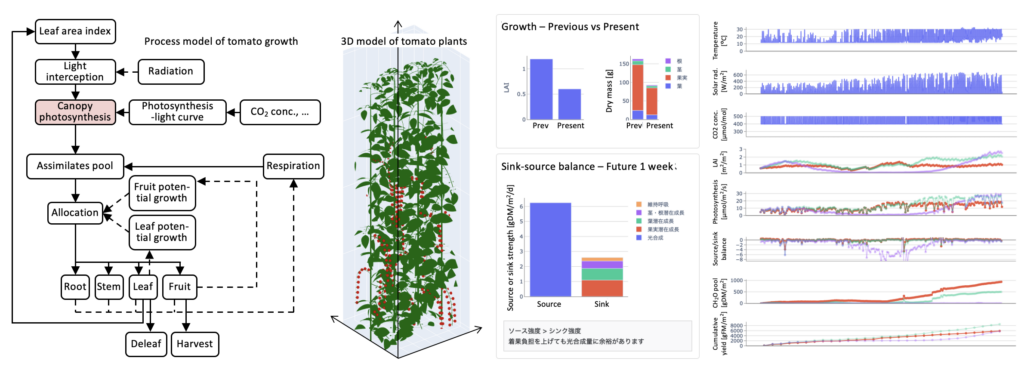 Mathematical and data-driven models are used to analyze plant growth, source-sink relationships, and interactions between crops and greenhouse environments.